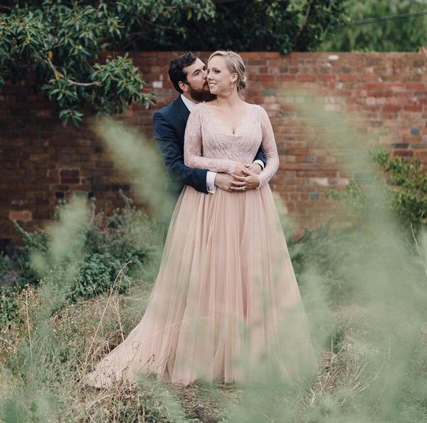 Discount Plus Size Colored Country Wedding Dresses Long Sleeves With Bling Sequins V Neck A Line Tulle Lace Bridal Gowns For Maternity Western 2018