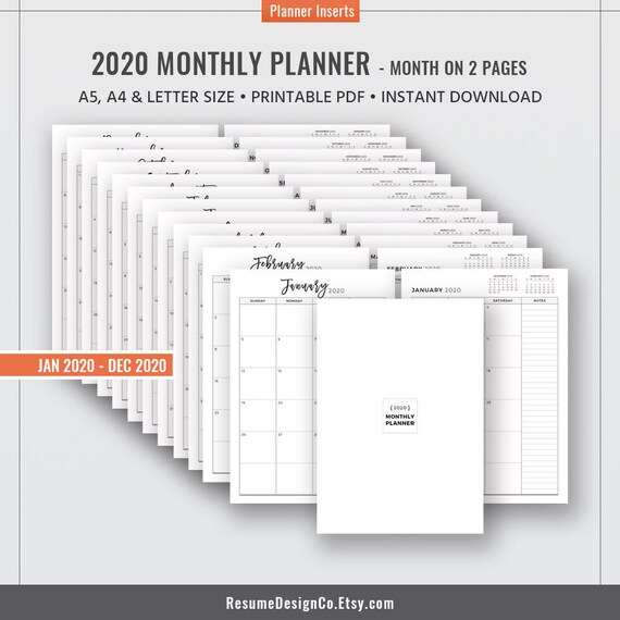 2020 Monthly Planner Monthly Calendar 12 Month Planner Etsy